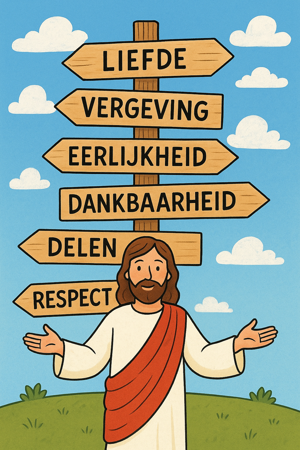Materiaal: 6 wegwijzerkaartjes op de grond (liefde, vergeving, eerlijkheid, dankbaarheid, delen, respect)