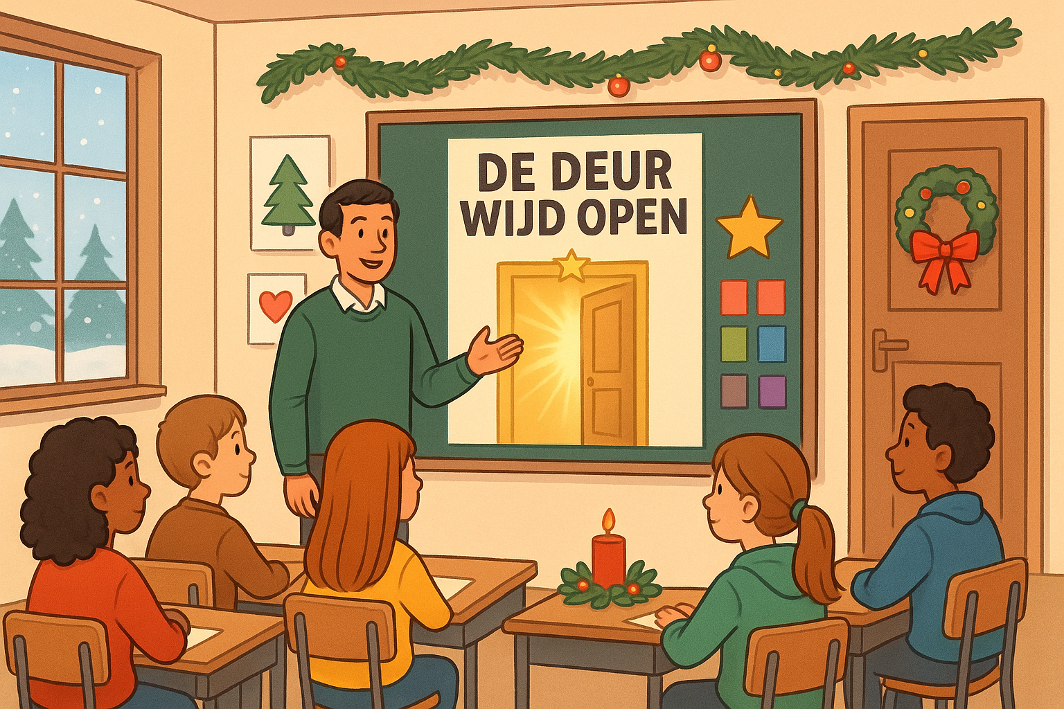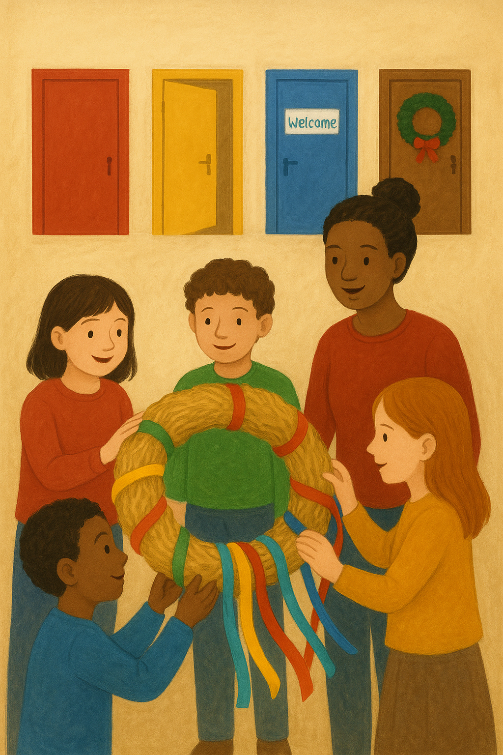 Elke les werken we aan een nieuwe deur. Vandaag de deur met de krans. We denken na over wat het betekent om echt welkom te zijn.