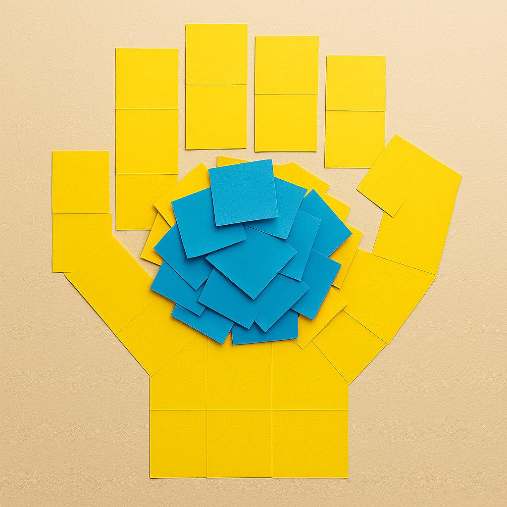 - Die post-its in de vorm van een vuist rondom de blauwe post-its ophangen.